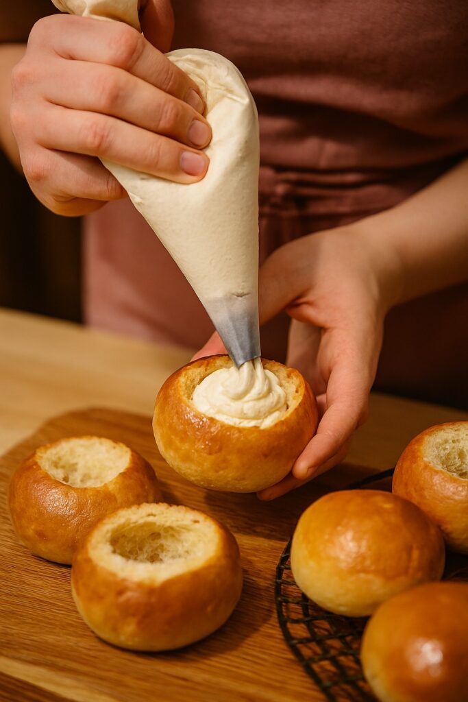 生地はしっかりこねてグルテンを形成することが大切です。発酵不足だとふんわり感が出ず、焼き上がりが硬くなってしまいます。また、クリームは直前に絞ることで、時間が経っても水っぽくならず美しい仕上がりを保てます。