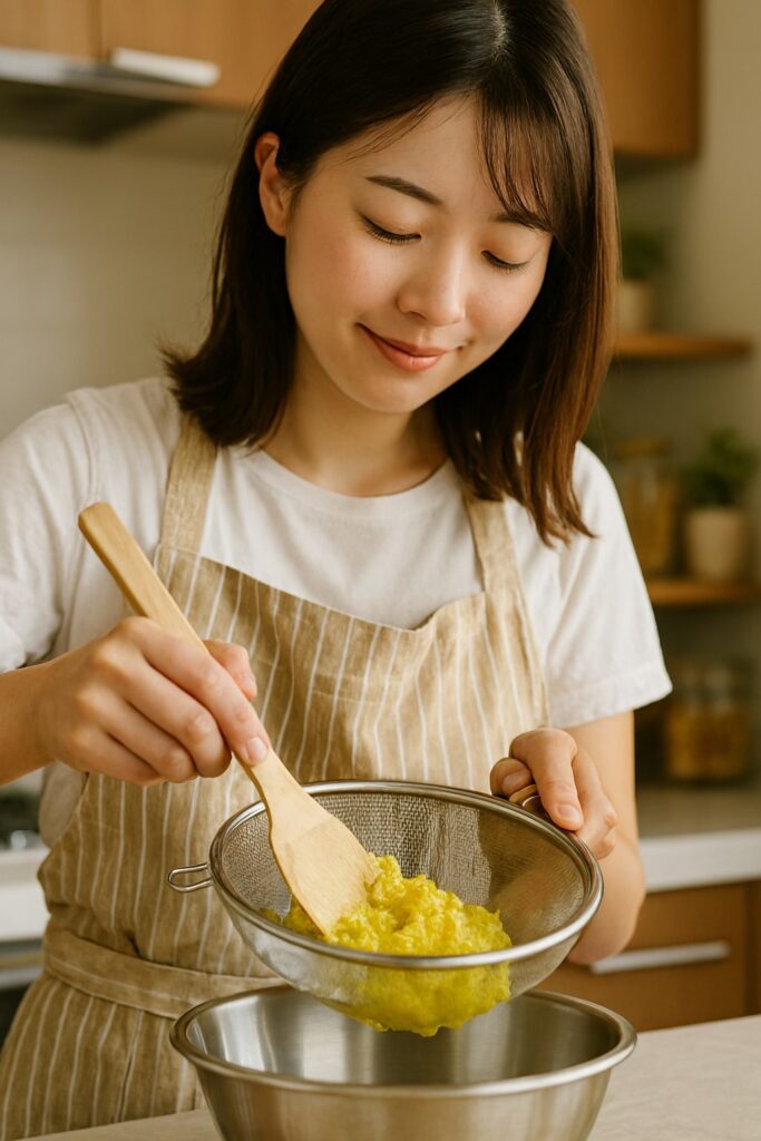- 裏ごし器やこし器で丁寧に裏ごしし、なめらかにする。