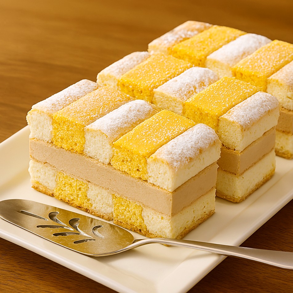 「シュニッテン」はドイツ語の「シュニッテ(切る)」の複数形で、長方形に切り分けられることが特徴のスイーツを意味します。