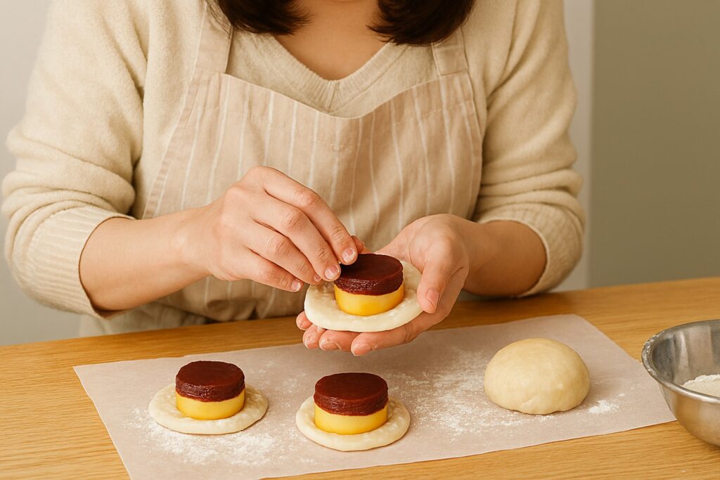 - 輪切りのさつまいもとあんこをのせ、生地で包む。